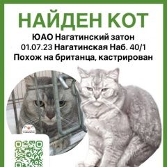 Найден кот британской породы, кастрированный, чистый. Район Нагатинский Затон, ЮАО