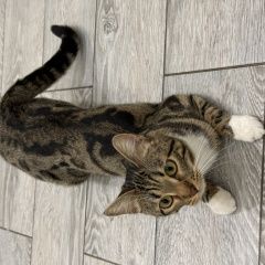 ПОМОГИТЕ НАЙТИ КОШКУ пропала кошка по кличке Ева. Приметы: Окрас пятнистый (табби), на лапках белые «носочки» (Фото прикрепляю) Характер: Может быть напугана и прятаться в подвалах, под машинами или в кустах. Если вы видели похожую кошку или она забежала к вам, пожалуйста, свяжитесь со мной.. Будем благодарны за любую информацию