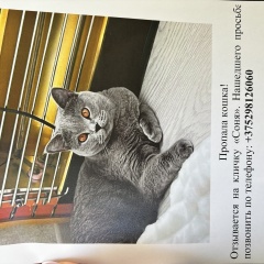 Пропала британская кошка в районе ДСК, Витебск. Отзывается на кличку «Соня». Просьба позвонить, кто видел ее, в каком районе, ..