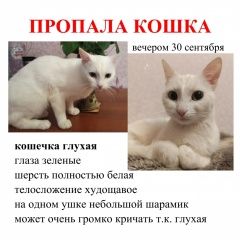 30 сентября в районе Пизвода (г. Воронеж, ул. 9 Января, Машиностроителей, Торпедо, Загородная) пропала кошка (телосложение худощавое, шесть белая, глаза зеленые, на одном ушке небольшой шрамик, кошечка ГЛУХАЯ и из-за этого может громко кричать Будем очень благодарны за любую информацию о местоположении Белочки. Гарантируем вознаграждение